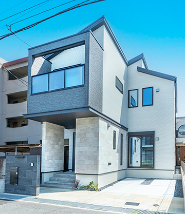 阪急宝塚線「曽根」駅利用可 全9区画のモダンスクエアの邸 暮らしやすいフラットエリアにデビュー。自然の風景と調和する優しくモダンな外観デザイン。
