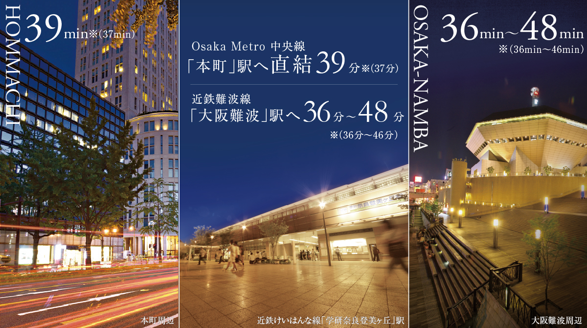 「学研奈良登美ヶ丘」駅は、Osaka Metro中央線と相互乗入れする近鉄けいはんな線の始発駅です。ビジネスの中枢「本町」駅へは乗換えなし。