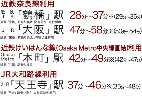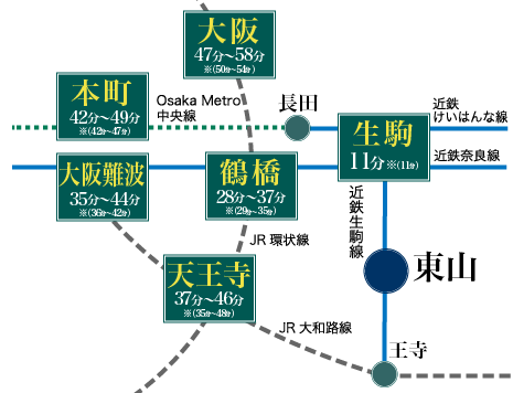※掲載の所要時間は平日通勤時(7、8時台)、( )内は日中平常時(11~15時台)の目的駅への所要時間です。電車の所要時間は時間帯により異なります。